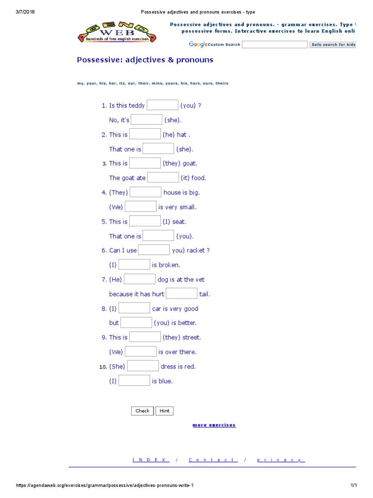 Possessive pronouns exercises online agendaweb. Possessive adjectives - English grammar exercises online.